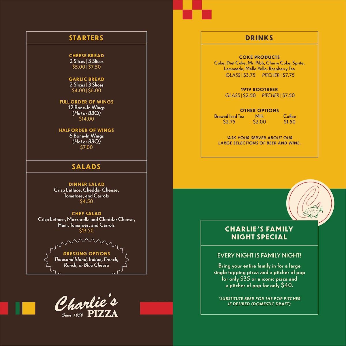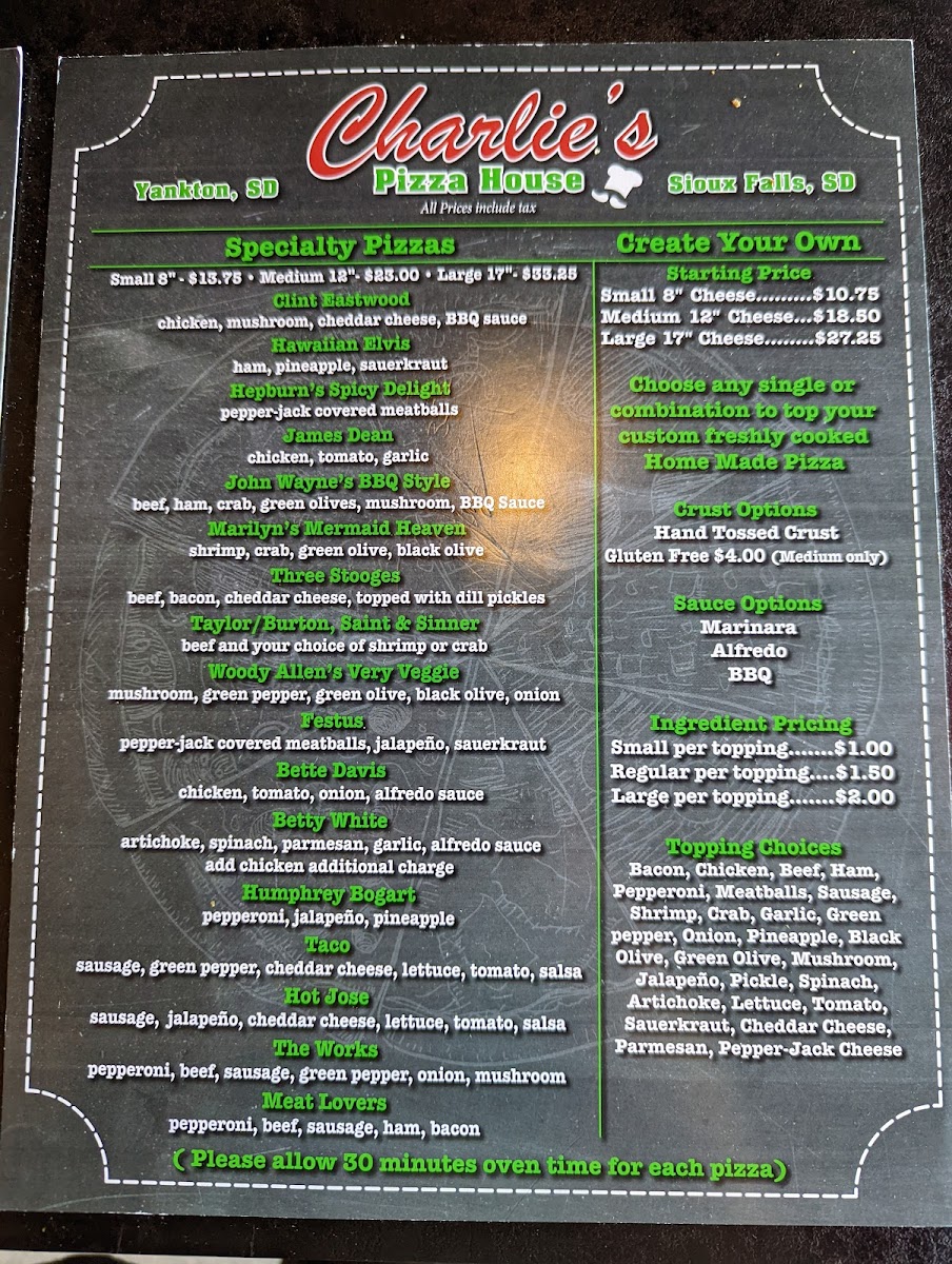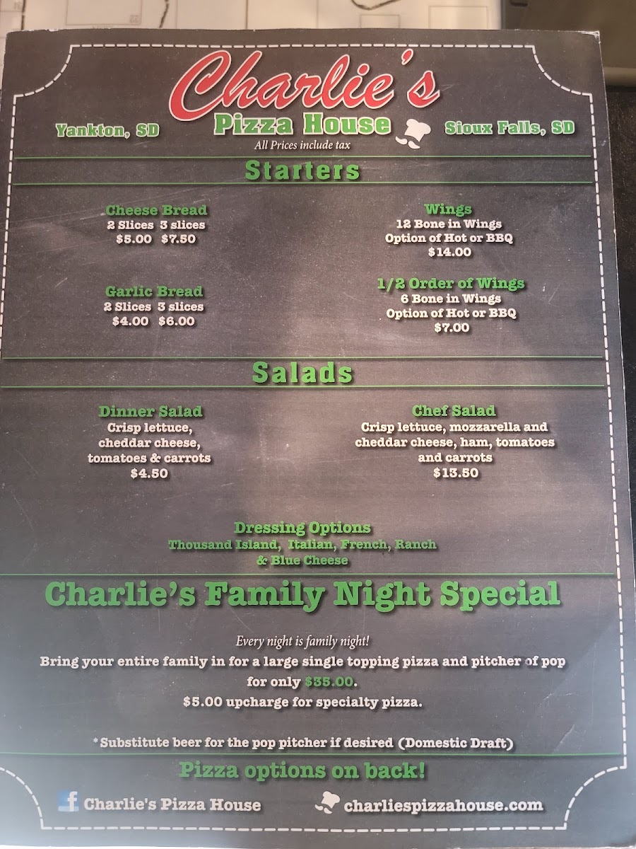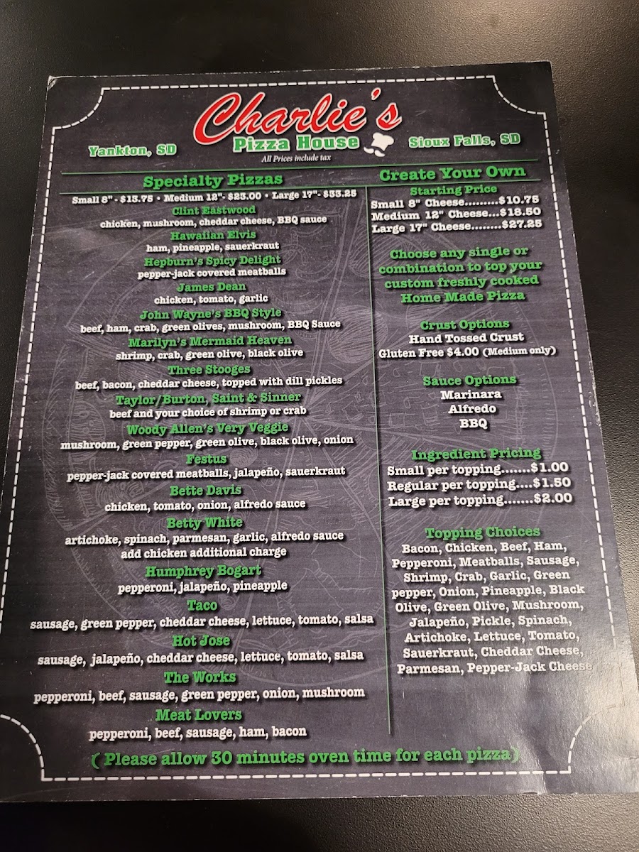 Welcome to Charlie's Pizza - Sioux Falls, where pizza lovers unite! Nestled in 6213 S Old Village Pl, this charming eatery offers a delightful experience for families and friends alike. The menu is a treasure trove of flavors, featuring the iconic Create Your Own Pizza option, with a large cheese pizza priced at just $22.00.